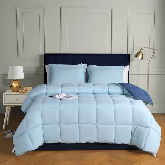 This 3-piece comforter set is reversible with two different colors, so your bedroom color scheme easily changes with your mood. It includes one comforter and two coordinating pillow shams. Each piece is made from a microfiber/polyester that’s machine washable and tumble dry-able. We love that the comforter features a gridded box stitch and has a warmth rating for all seasons. Plus, the smooth solid colors allow you to pick fun, contrasting prints for your sheets.