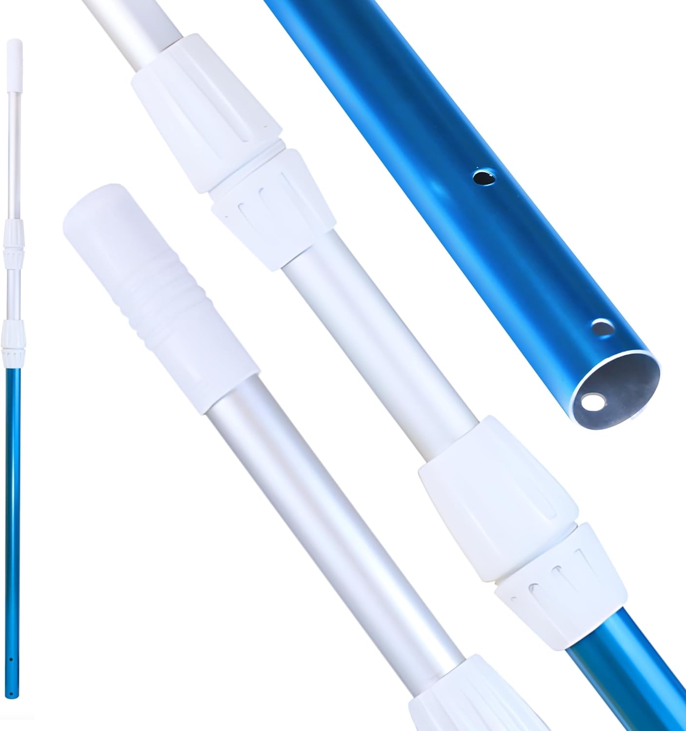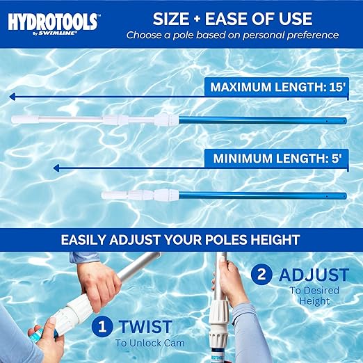 {VERSATILE DESIGN} Telescopic technology coupled with reinforced, slip resistant locking cams provides a wide range of available pool pole lengths. Comes in three pieces, extend from 5 to 15 feet, allowing access to every spot & angle of your pool.