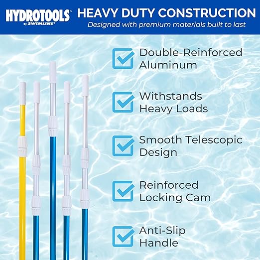 {LIGHTWEIGHT DESIGN} Innovative Hydrotools construction optimizes the way your telescopic pole glides through the water, making cleaning easier, allowing more time to enjoy. Rubber reinforced handle allows for a firm comfortable, enjoyable grip.